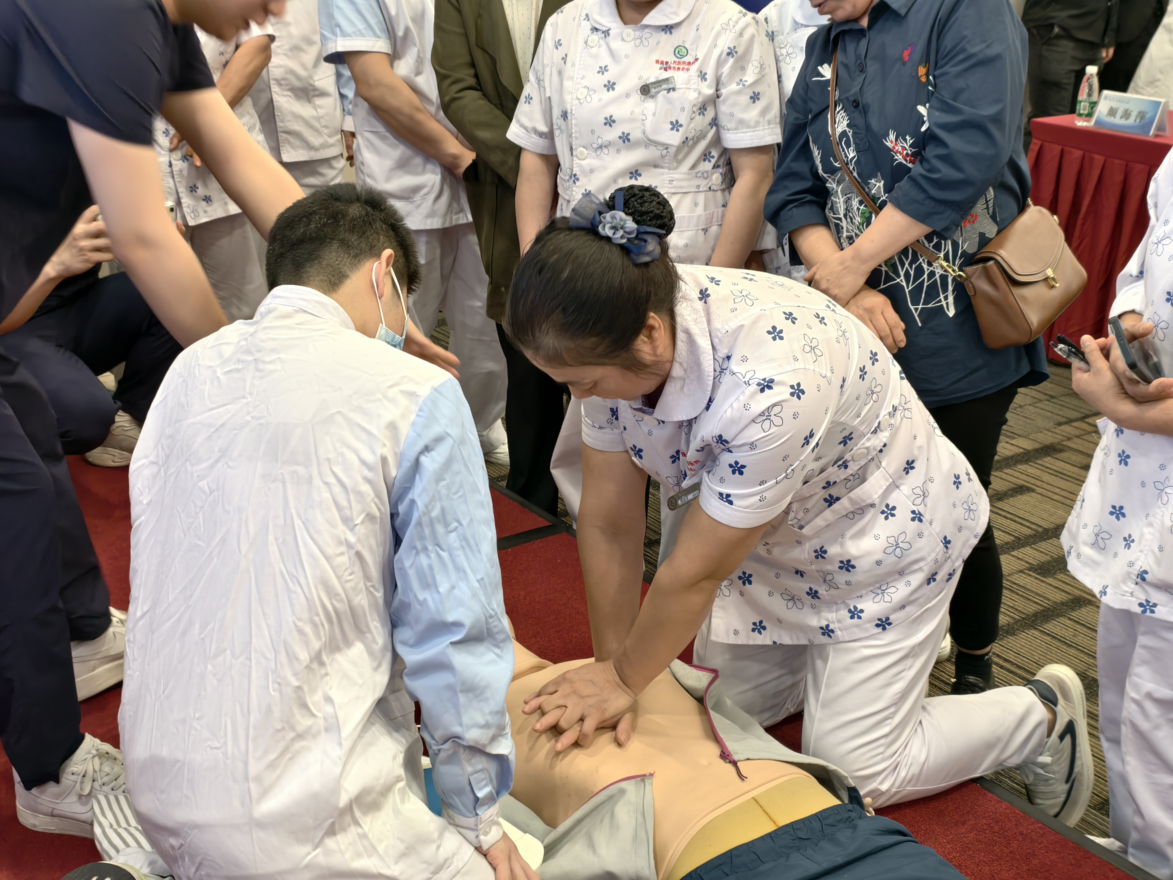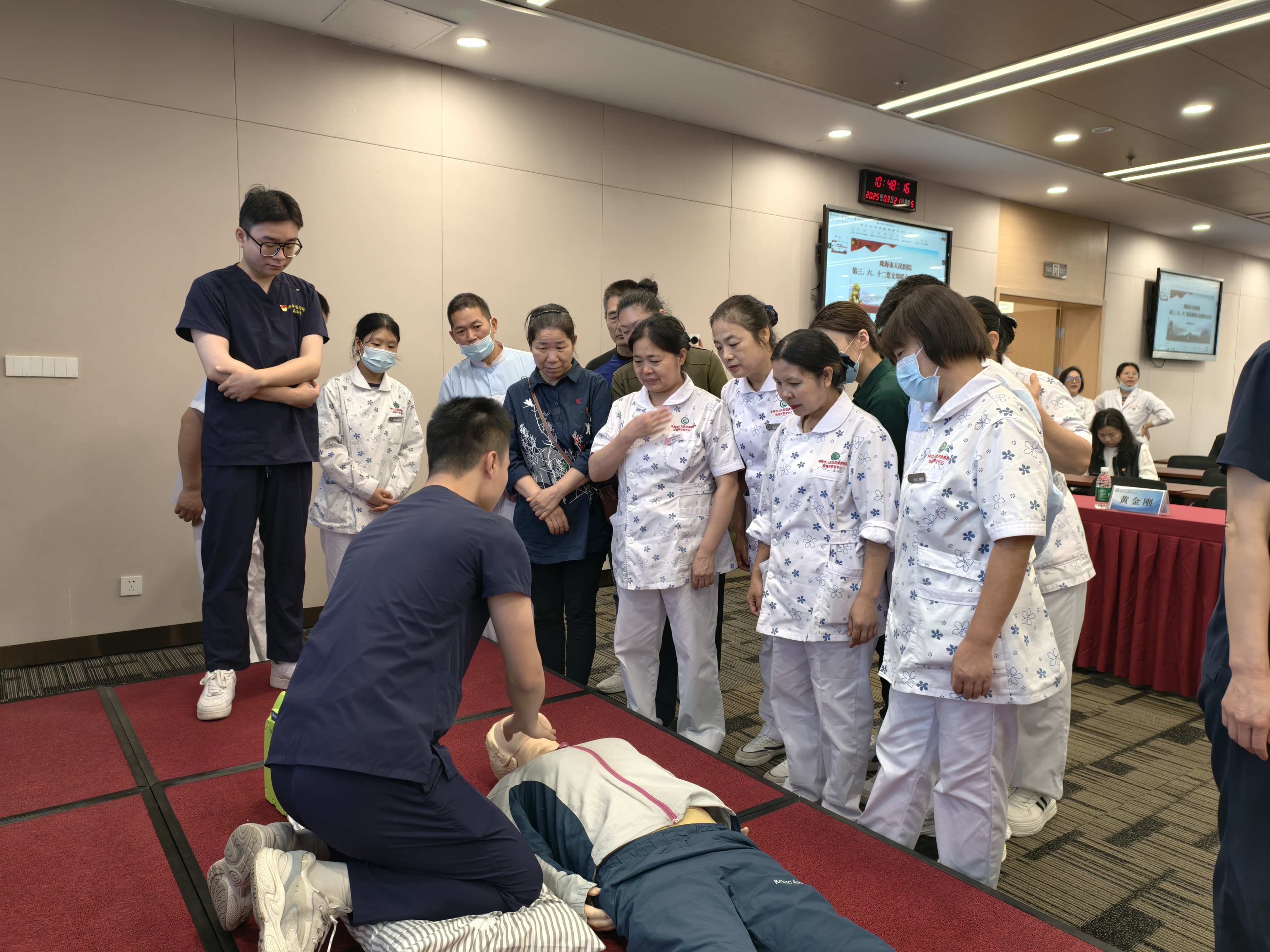 第三党支部急诊医学部主任贺艳首先通过视频演示的方式为大家详细讲解了心肺复苏(CPR)与自动体外除颤器(AED)操作要点,包括心脏骤停的判断方法、胸外按压的操作顺序、按压姿势、深度、频率及次数等基本急救知识与动作要领。在随后的实操环节中,市养老中心的医护人员、介护师和照护师们进行了分组练习,通过模拟场景反复打磨动作要领,现场互动气氛热烈,学习成效显著。
